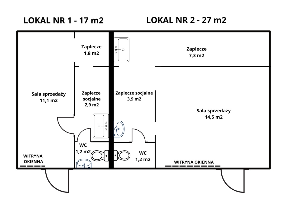 Lokal składa się z : Sala sprzedaży – 14,5 mkw., Zaplecze – 7,3 mkw., Zaplecze socjalne – 3,9 mkw, WC – 1,2 mkw.