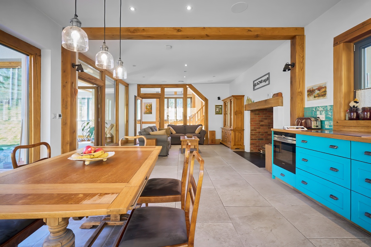 Dom o powierzchni 214 m2 (177 m2 powierzchni użytkowej) został wykończony z wysokiej klasy materiałów, z dbałością o każdy detal. Wnętrza wyróżniają się szlachetnymi dębowymi podłogami, kamiennymi posadzkami, włoską ceramiką oraz eleganckim kominkiem, który nadaje przestrzeni ciepły, nieprzemijający charakter.