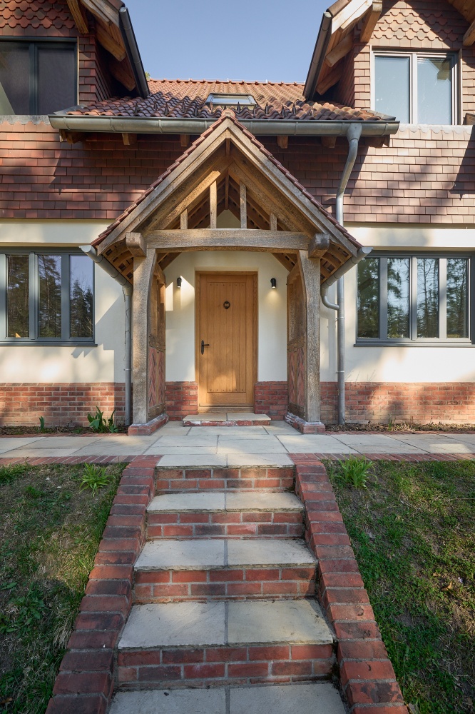 Duże przeszklenia otwierają dom na otaczający las, zapewniając naturalne dzienne światło i widok, który staje się integralną częścią codziennego życia.