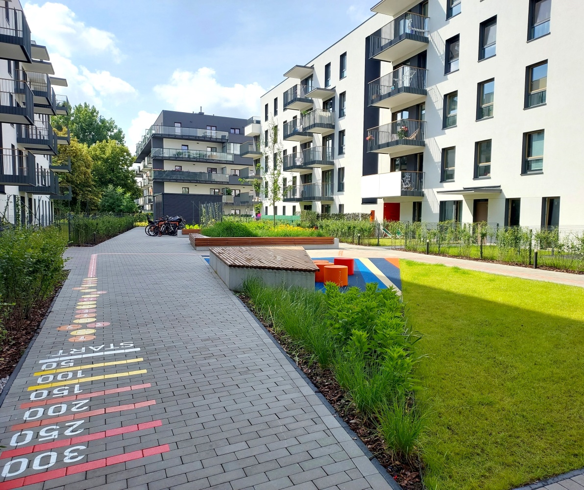 Nowe osiedle, teren zamknięty z ochroną, wewnętrzne patio ze stojakami na rowery i strefą wypoczynkową.