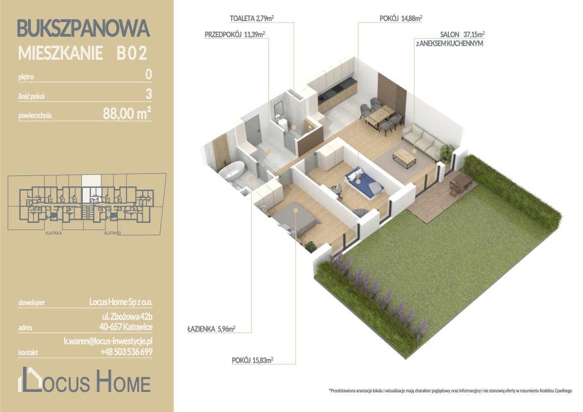 Spółka LOCUS HOME to deweloper który realizuje inwestycje mieszkaniowe na terenie Katowic od wielu lat. NOWA inwestycja na ulicy BUKSZPANOWEJ (obok nr 19) w Piotrowicach to nowoczesny apartamentowiec w doskonałej lokalizacji Katowic.