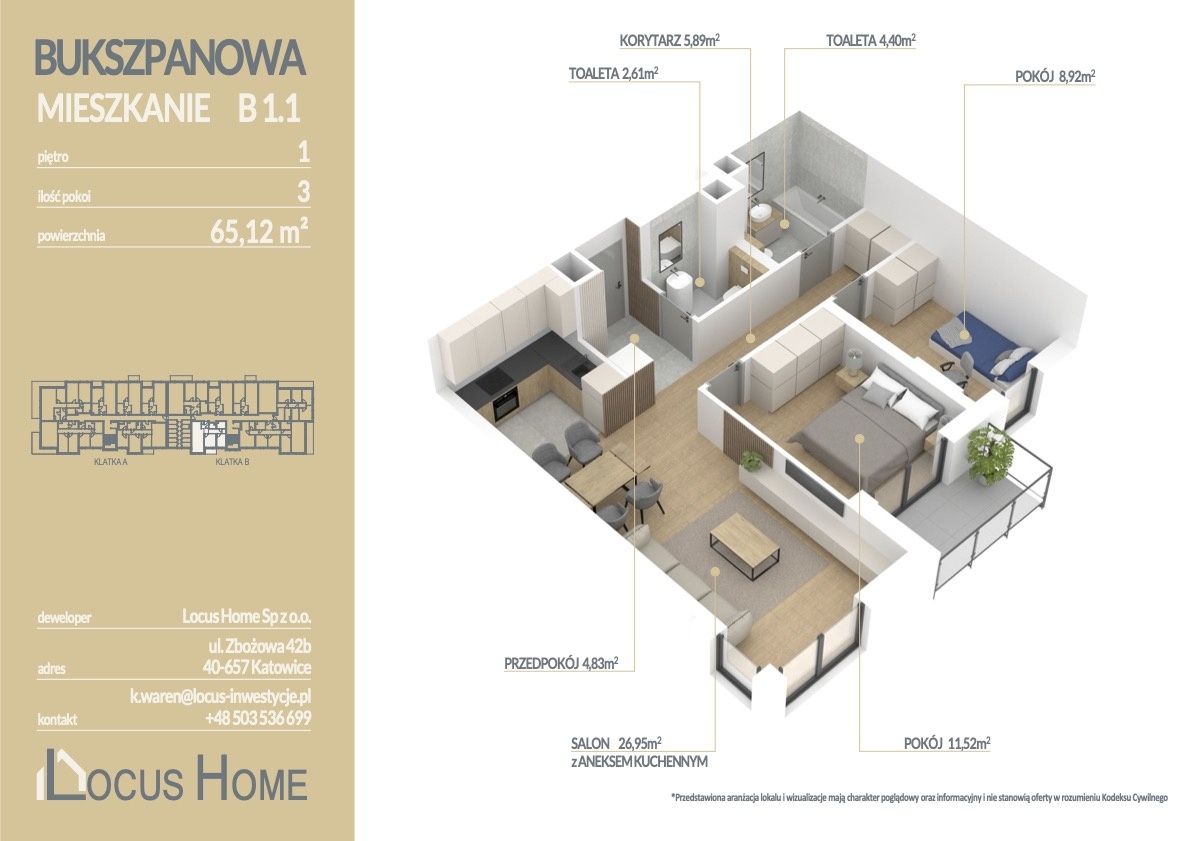 Przedstawiamy ofertę mieszkania 3 – pokojowego o powierzchni 65,12 m² z balkonem, zlokalizowanego na pierwszym piętrze budynku, oznaczonego nr B 1.1