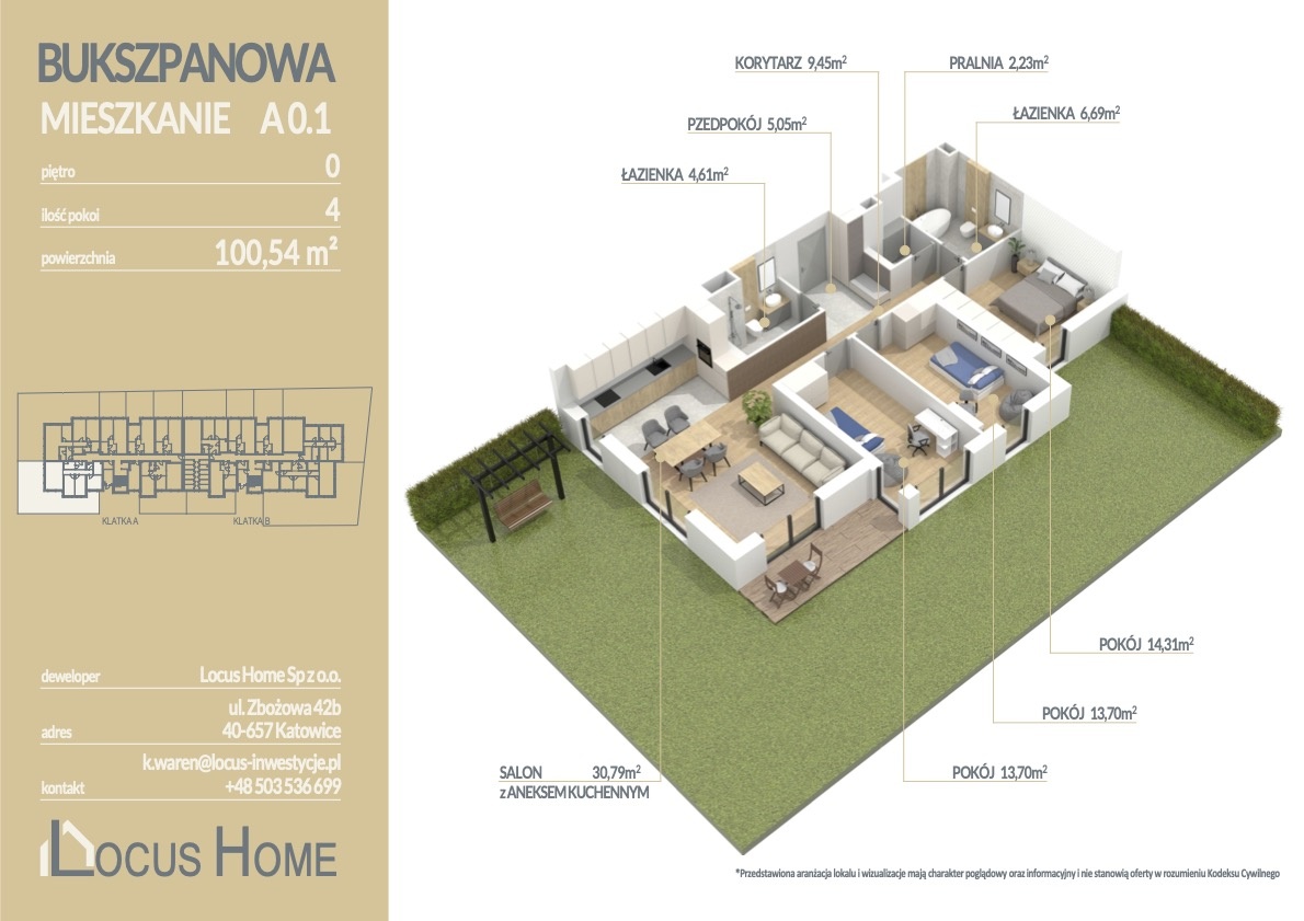 Przedstawiamy ofertę mieszkania 4 – pokojowego o powierzchni 100,54 m² z OGRÓDKIEM 153 m², zlokalizowanego na parterze budynku, oznaczonego nr A 0.1