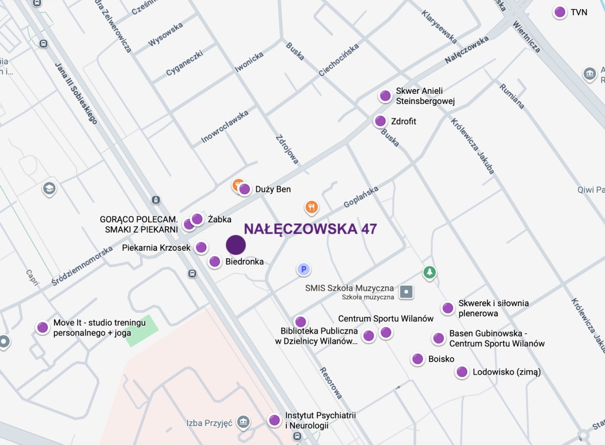 Mieszkanie znajduje się przy skrzyżowaniu ulic Sobieskiego i Nałęczowskiej na granicy Dzielnic: Mokotów i Wilanów.