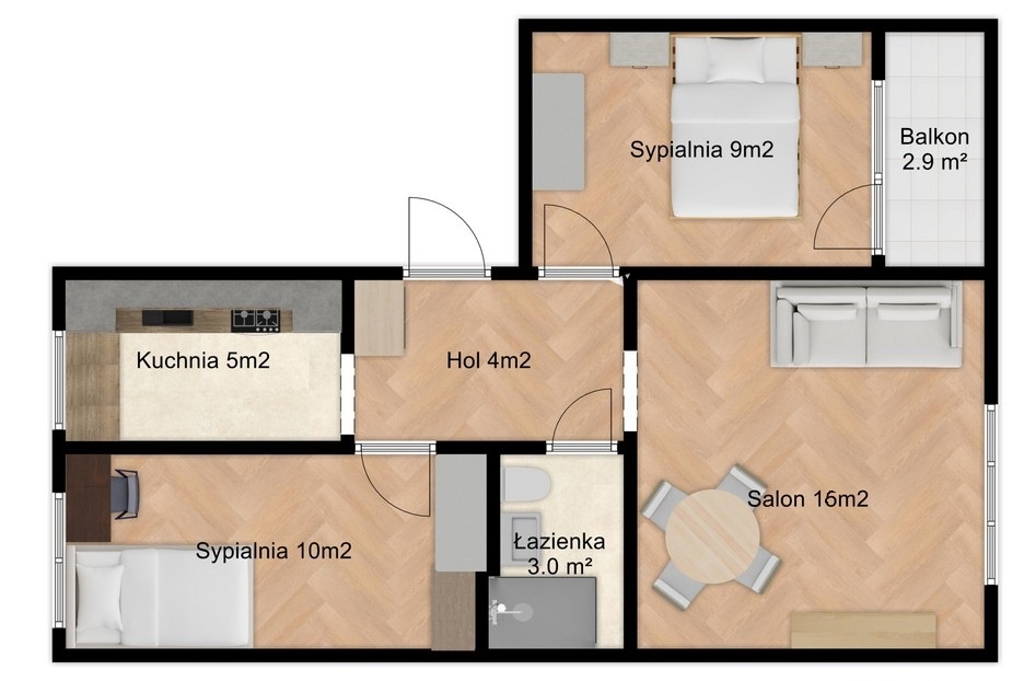 Układ: ustawny salon (15m2), sypialnia (9m2) z wygodną loggią, pokój (10m2), kuchnia (5m2), łazienka (3m2) oraz przedpokój (4m2). Do mieszkania przynależy piwnica. Mieszkanie dwustronne (północ-południe), jasne, oddalone od ulicy.
