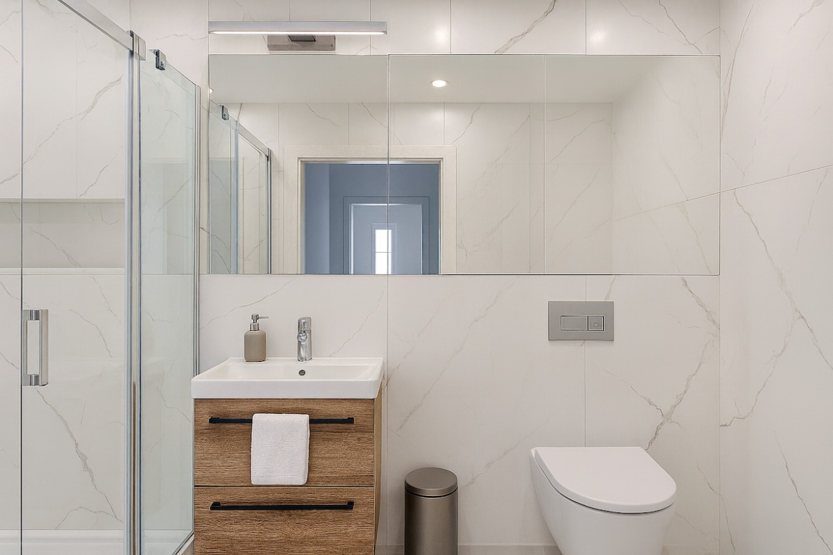 ✓ Duży prysznic + dużo półek i szafek — praktycznie, bez kompromisów.