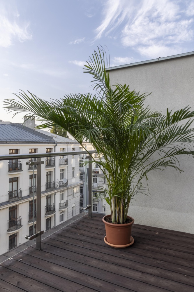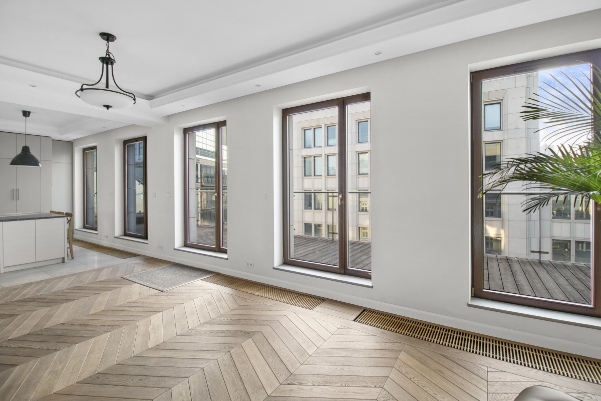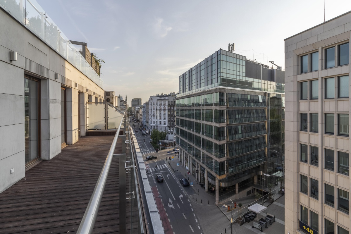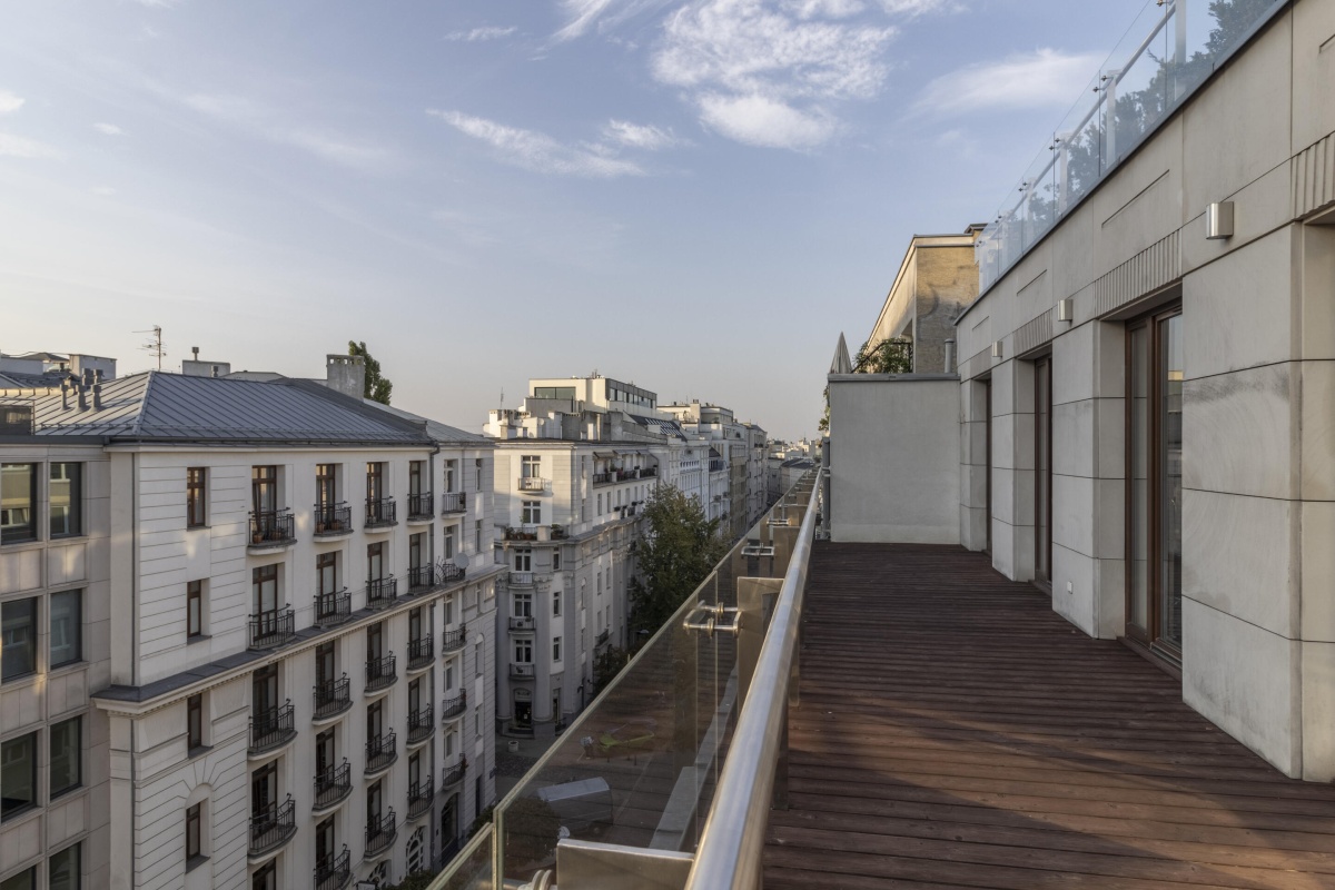 – Duży taras, z modrzewia syberyjskiego o powierzchni 30 m², z widokiem na miasto i oś ulicy Mokotowskiej, idealny na poranną francuską kawę, relaks przy zachodzie słońca na świeżym powietrzu czy wieczorne spotkania z przyjaciółmi. Taras jest wycofany od ulicy, co zapewnia ciszę, spokój i prywatność.