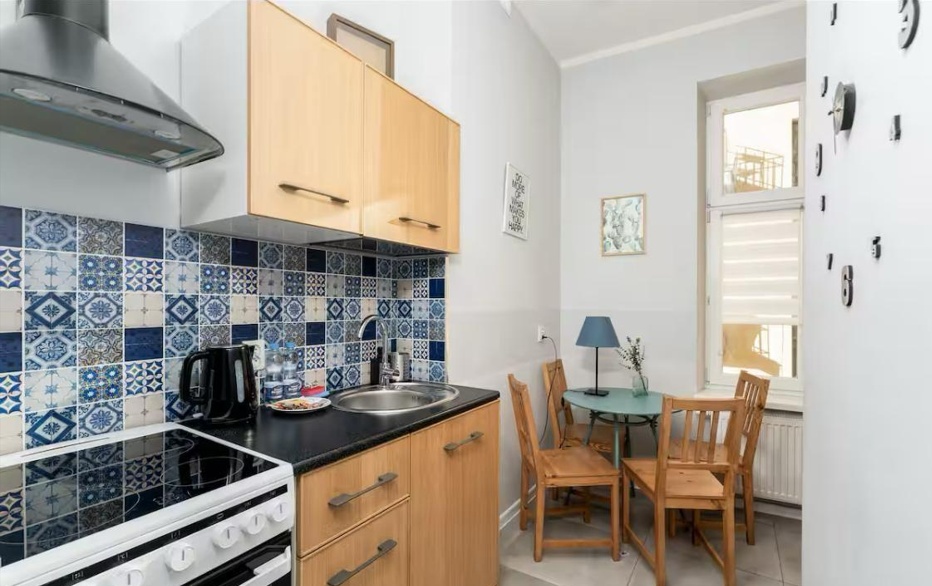 Oddzielna kuchnia – w pełni umeblowana i wyposażona w sprzęty AGD (lodówka, kuchenka, piekarnik), z miejscem jadalnianym