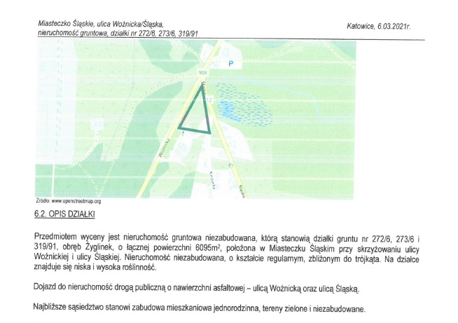 Na działkach znajduje się niska i wysoka roślinność. Najbliższe sąsiedztwo stanowi zabudowa mieszkalna jednorodzinna, tereny zielone i niezabudowane. Dojazd do nieruchomości odbywa się drogą publiczką o nawierzchni asfaltowej ul. Woźnicką oraz ul. Śląską.