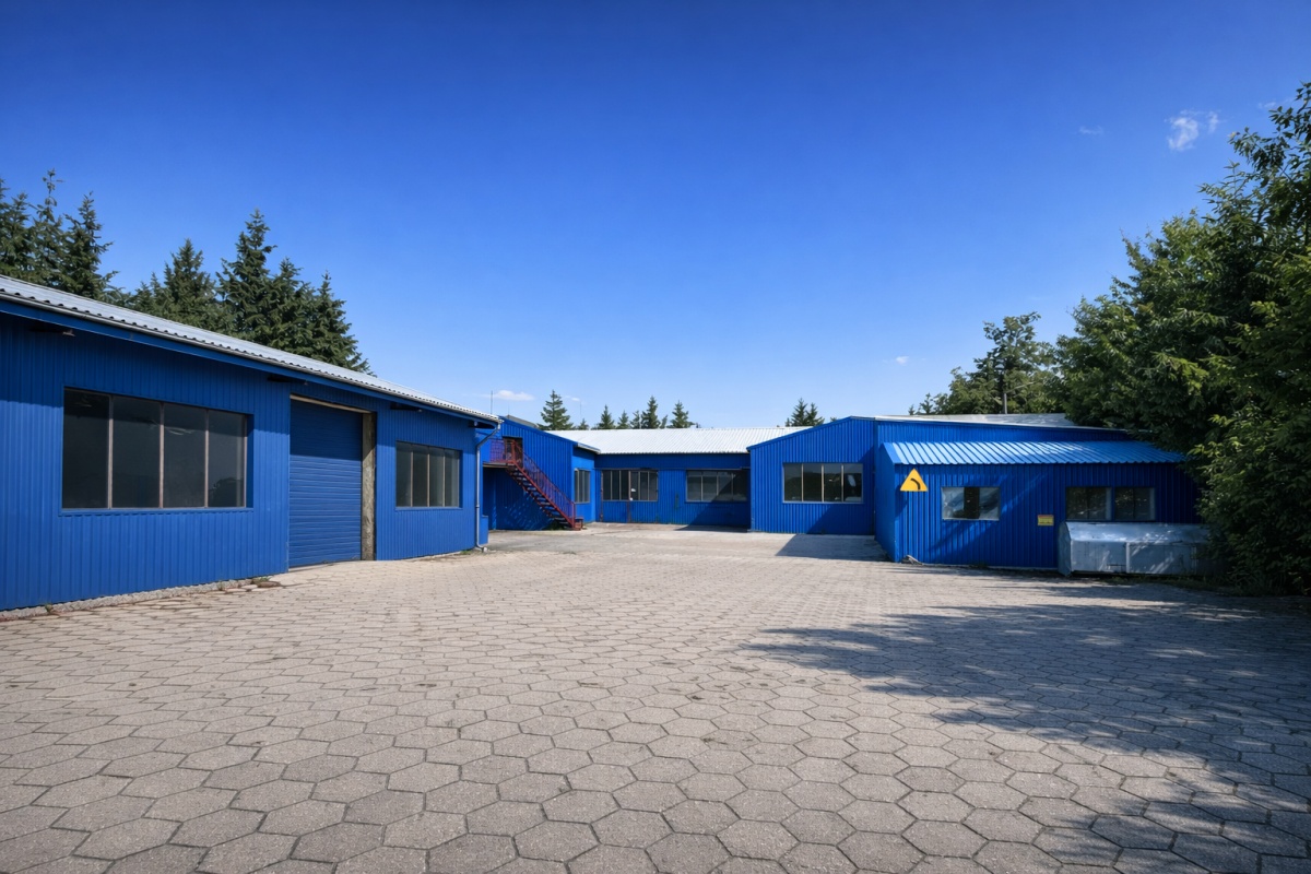 Na sprzedaż kompleks trzech hal produkcyjno-magazynowych o łącznej powierzchni 1398 m², położony na działce 5471 m² w strefie przemysłowo-usługowej miasta Mrągowo.