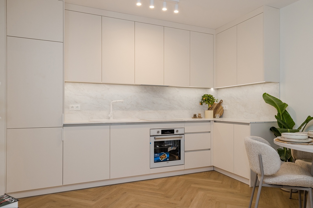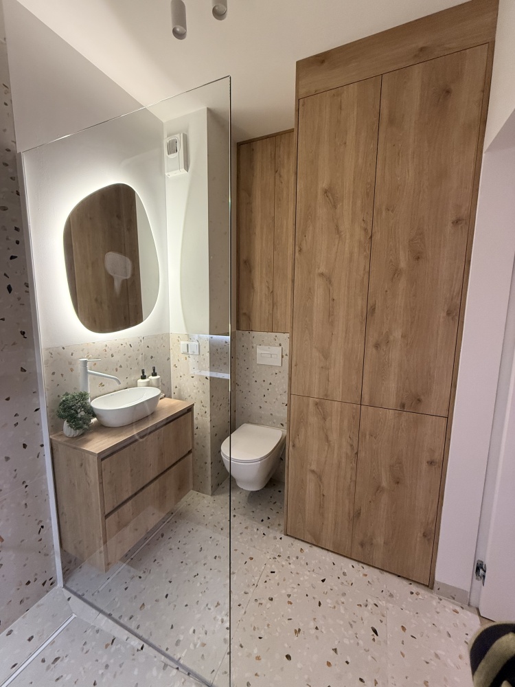 To mieszkanie nigdy nie było zamieszkane. Wszystko jest fabrycznie nowe i objęte gwarancją – od sprzętów AGD po zabudowy stolarskie. Całość została zaprojektowana tak, aby maksymalnie wykorzystać przestrzeń: w kuchni, przedpokoju i łazience wykonano zabudowę na wymiar, która łączy funkcjonalność z elegancją.