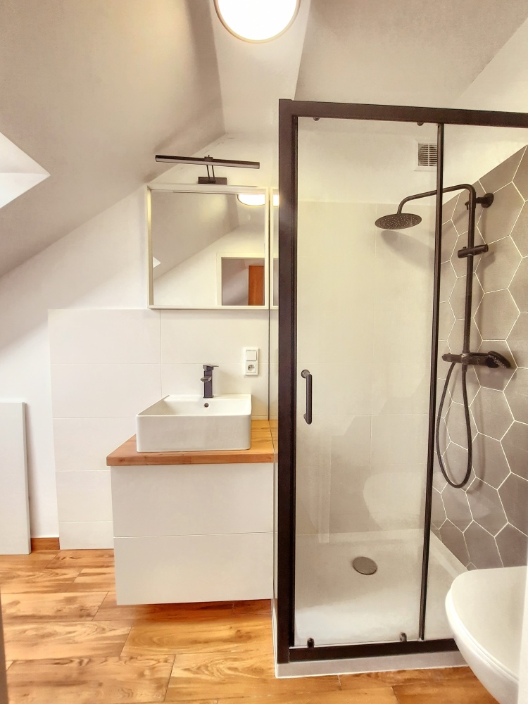 Mieszkanie na pierwszym piętrze i poddaszu jedno piętrowego budynku z 2008 roku. Do mieszkania przynależy ogródek i dwa miejsca postojowe na terenie wspólnoty. Miejsca dodatkowo płatne – łączna cena miejsc 50 000 złotych.