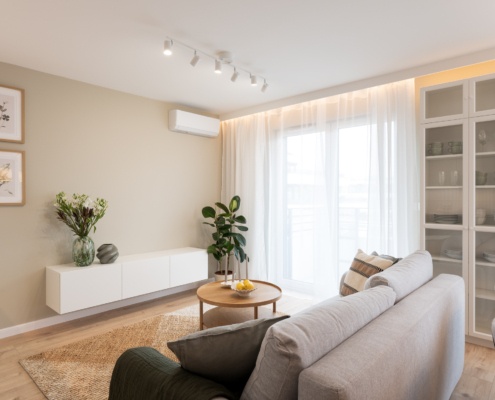 Przestronny salon z aneksem kuchennym (31,08 m²) – ekspozycja na 3 strony świata, z klimatyzacją, kompletną zabudową kuchenną i sprzętem AGD (płyta indukcyjna, piekarnik, zmywarka, lodówka, okap).