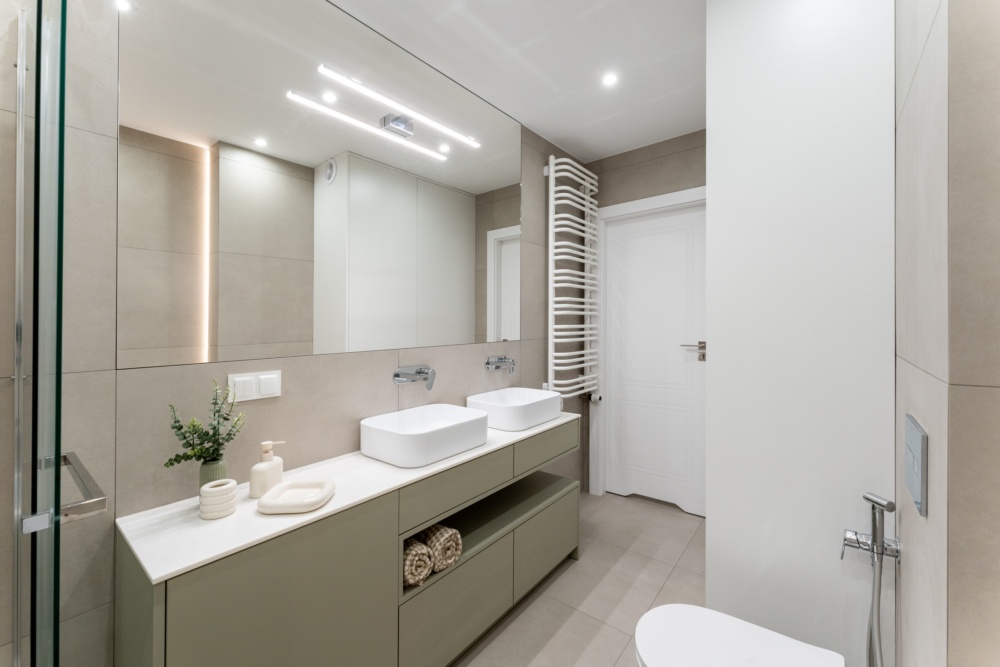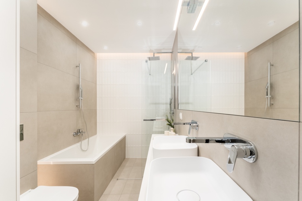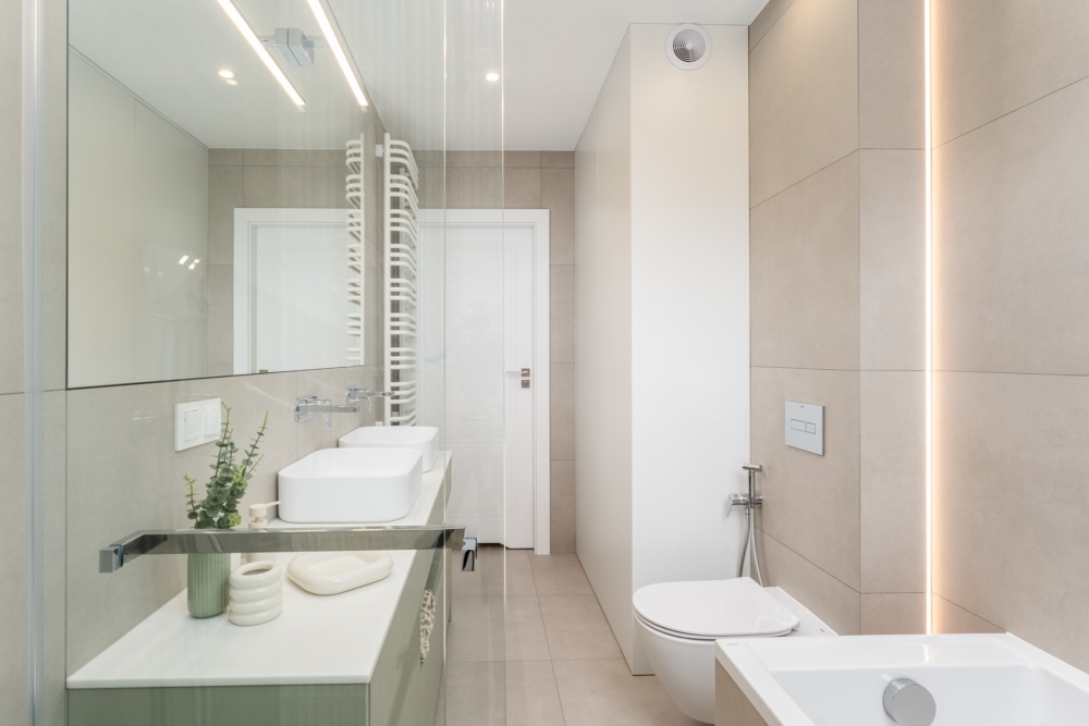 Łazienka (6,5 m²) – z wanną, prysznicem walk-in, szafką z dwiema umywalkami oraz zabudową z pralko-suszarką.