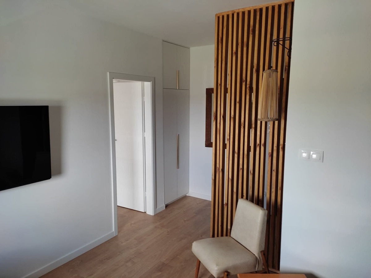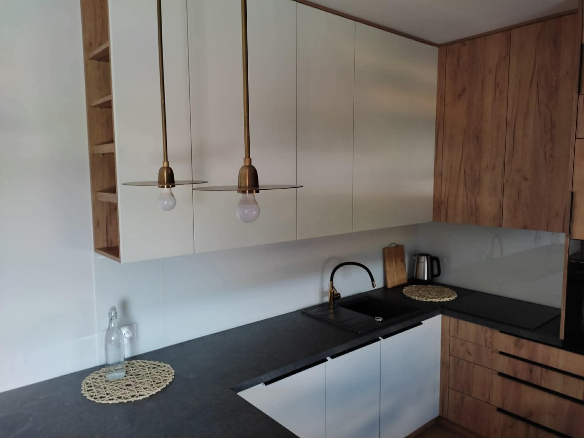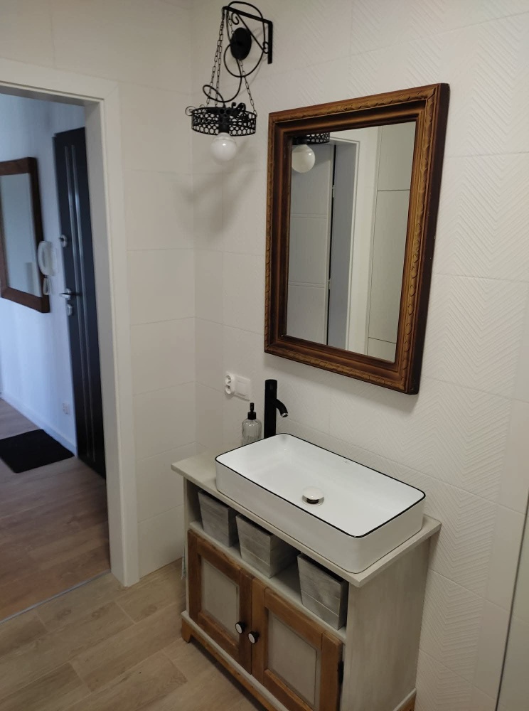 Wnętrze jest urządzone w nowoczesnym stylu -gotowe do wprowadzenia bez dodatkowych nakładów, w pełni umeblowane (w każdym z pokoi znajduję się rozkładana dwuosobowa sofa) i wyposażone we wszystkie sprzęty (pralka, zmywarka, lodówka, piekarnik, kuchenka, telewizor) oraz podstawowe artykuły codziennego użytku.