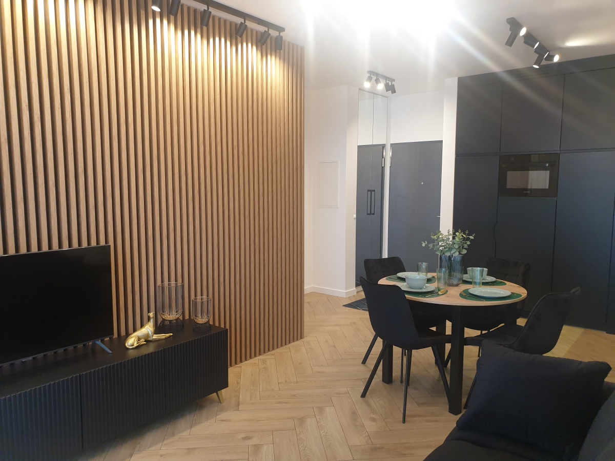 Apartament jest w pełni wyposażony. Przy wejściu do mieszkania znajduje się pojemna szafa. Aneks kuchenny posiada: lodówkę, zmywarkę, piekarnik z funkcją mikrofali, płytę ceramiczną wraz z okapem. Salon posiada telewizor z dostępem do TV kablowej. W sypialni jest wygodne łóżko 140×200 oraz bardzo pojemna szafa. W łazience została zamontowana kabina prysznicowa, duża ilość szafek mieszcząca kosmetyki oraz pralka.