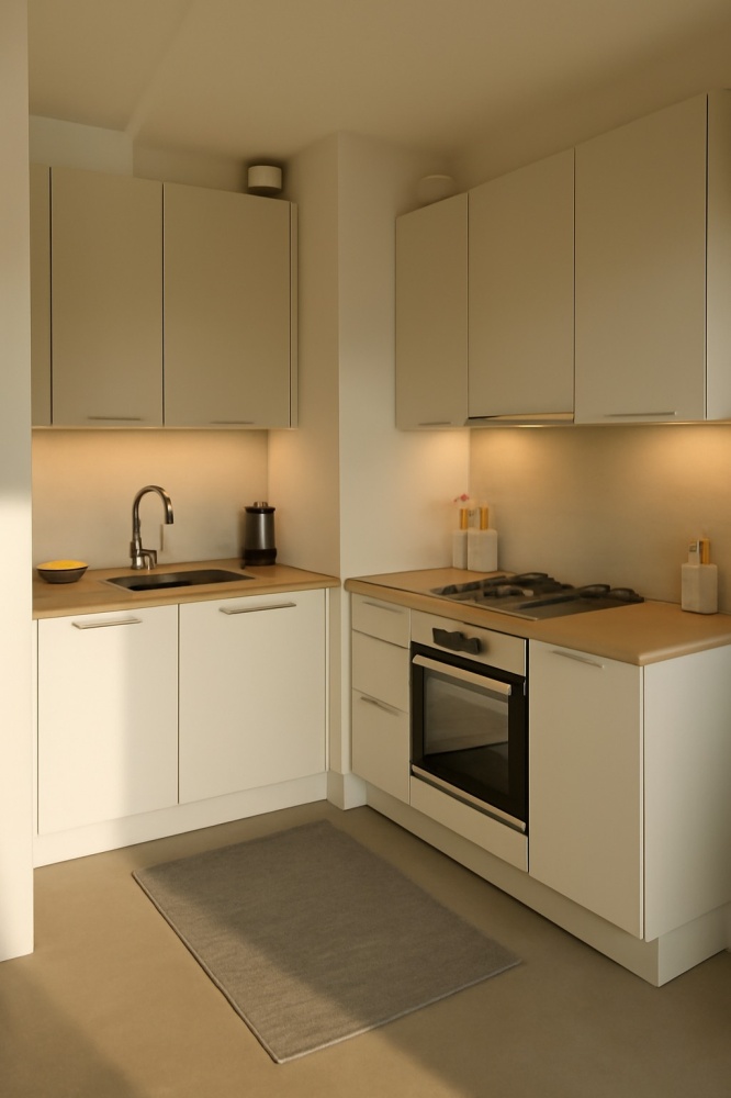 – mniejszy aneks kuchenny w rogu nie zaburza przestrzeni salonu