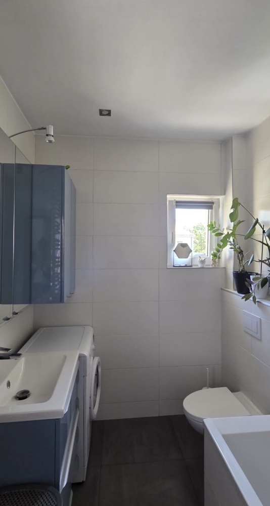 Łazienka z oknem (ok. 6 m²) + przedpokój (ok. 4 m²) z zejściem do piwnicy.