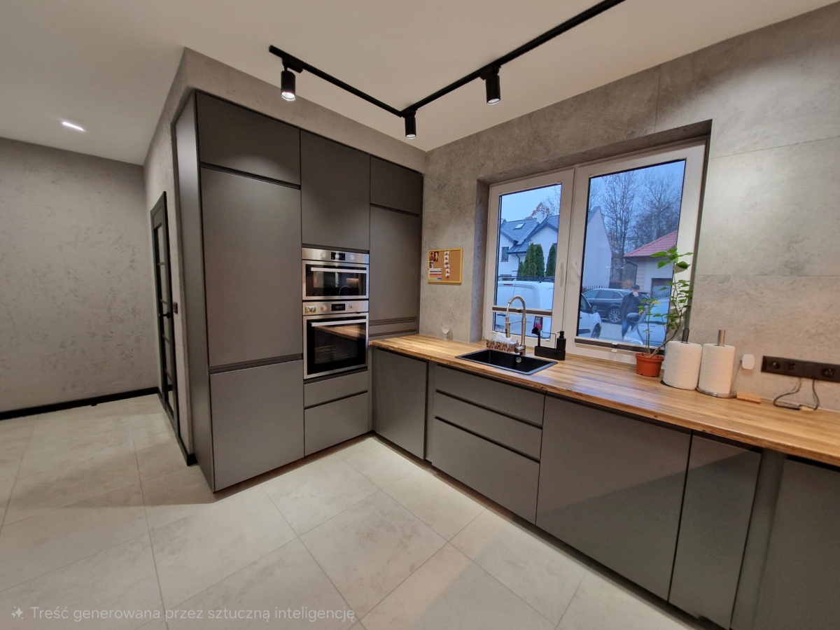 • Aneks kuchenny w oliwkowo-szarej zabudowie, pełne AGD