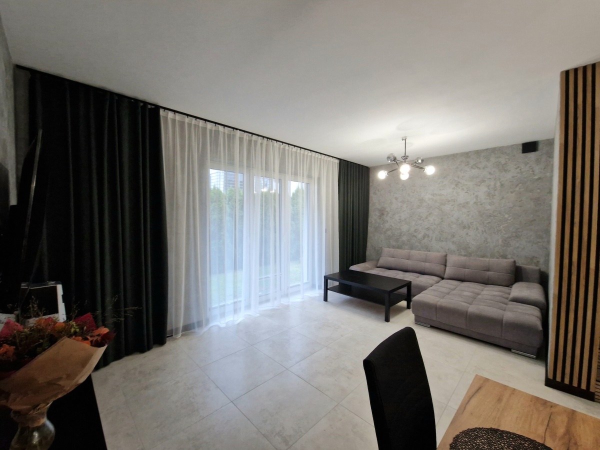 • Przestronny salon z aneksem kuchennym oraz wyjściem do ogrodu