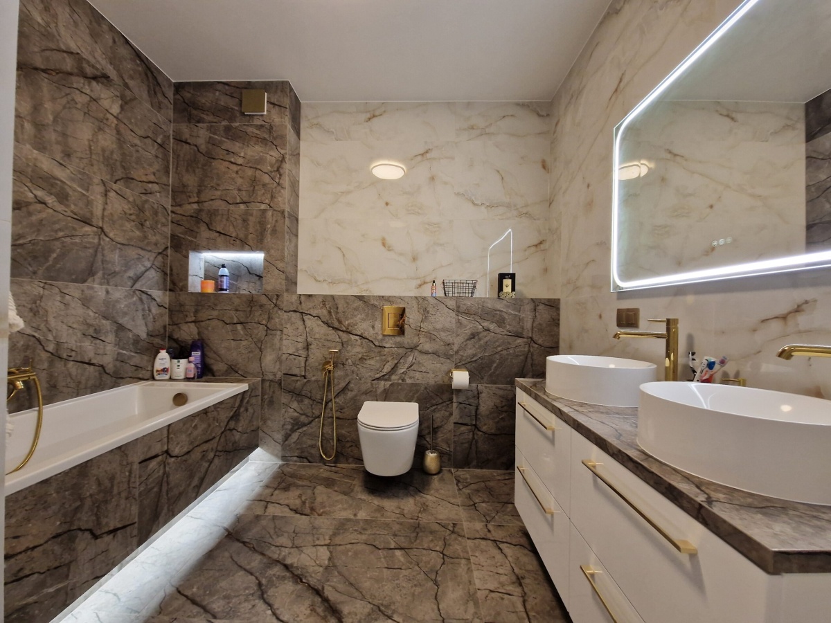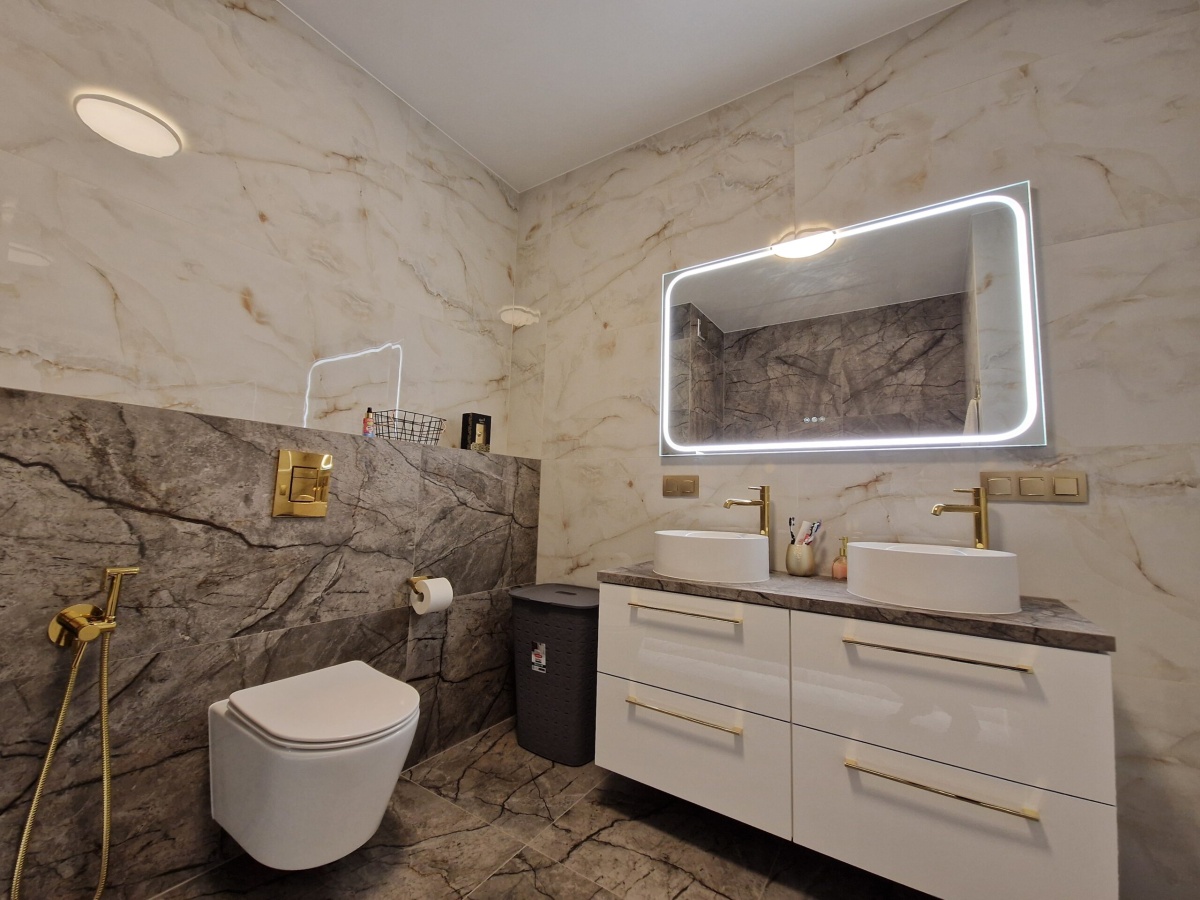 • Łazienka premium: styl marmur + kamień, podświetlenie LED , dwie umywalki, duże lustro, bidet, złota armatura, ukryte drzwi