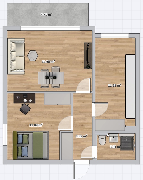 nowe meble na wymiar (zabudowa kuchenna, szafa wnękowa w korytarzu, szafa w sypialni, szafka rtv w salonie)