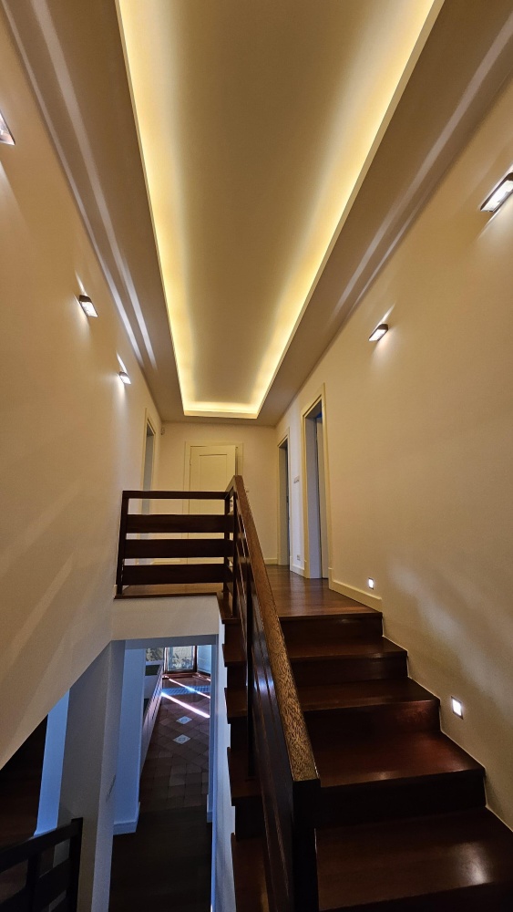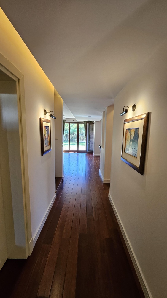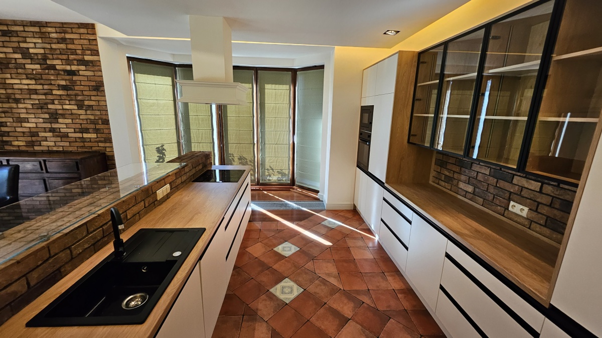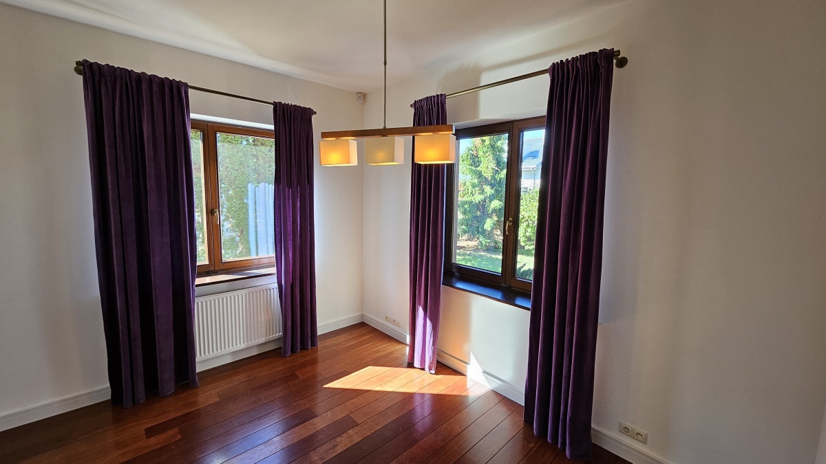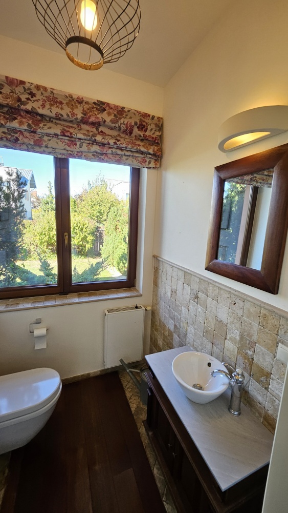 Dom wolnostojący, przestronny, komfortowy, położony w spokojnej części Łomianek Dolnych, przy ul. Karola Szymanowskiego 30. To moja ocena, więc może subiektywna, ale dom jest przepiękny, w stylu śródziemnomorskim. Układ pomieszczeń jest bardzo funkcjonalny. Całe wnętrze odnowione, całkiem nowa kuchnia. Od remontu nikt nie mieszkał więc można powiedzieć, że wnętrze prawie jak nowe. Gotowy do zamieszkania. Powierzchnia mieszkalna około 295 m², całkowita z garażem około 330 m². Foremna działka w kształcie prostokąta o powierzchni 1211 m². W ogrodzie piękne, dojrzałe rośliny, ukazujące swój urok w sezonie wiosenno-letnim, dające dużo intymności. Automatyczne podlewanie ogrodu. Garaż na dwa auta. Dojazd drogą asfaltową, wszystkie media. Dom idealny dla kogoś kto lubi przestrzeń, dla rodziny, do pracy zdalnej. W sumie 7 pokojów, otwarty salon z jadalnią i aneksem kuchennym, pralnia, miejsce na siłownię i saunę, garderoba przy sypialni głównej, dwie łazienki na piętrze, toaleta na parterze, poddasze użytkowe. Cicha okolica, dobry dojazd do Warszawy.