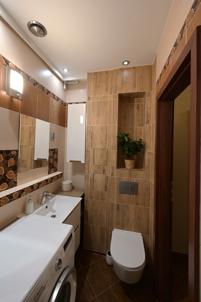 Lokal jest zadbany, urządzony w stonowanej kolorystyce, w pełni umeblowany i wyposażony w niezbędne sprzęty AGD: zmywarkę, piekarnik, kuchenkę oraz pralkę.