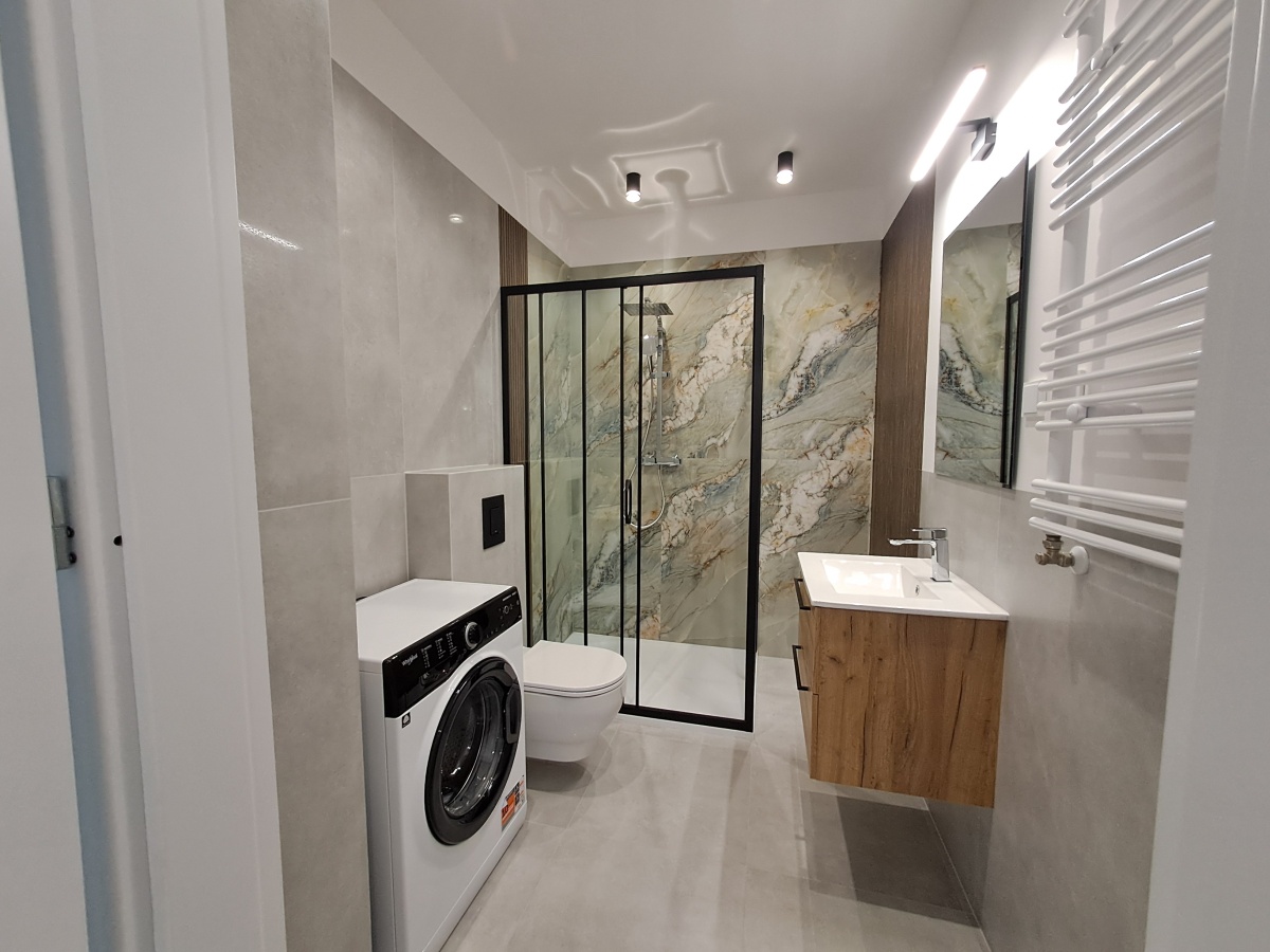 -łazienka z prysznicem i pralką