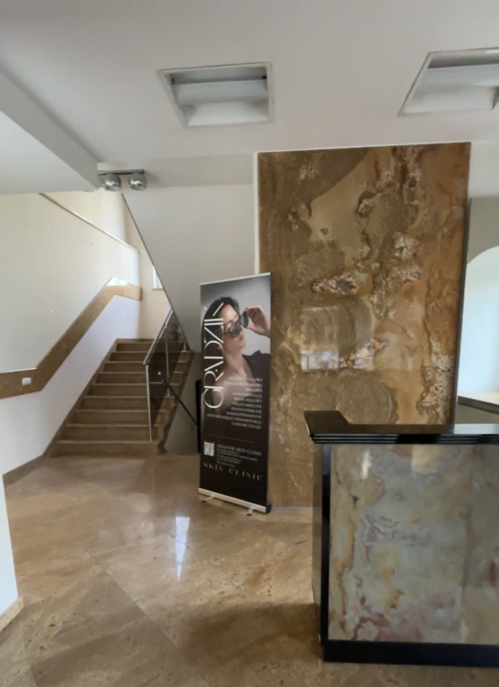 • Parter (131,7 m²): recepcja z poczekalnią, 2 duże pomieszczenia, pokój socjalny, łazienka
