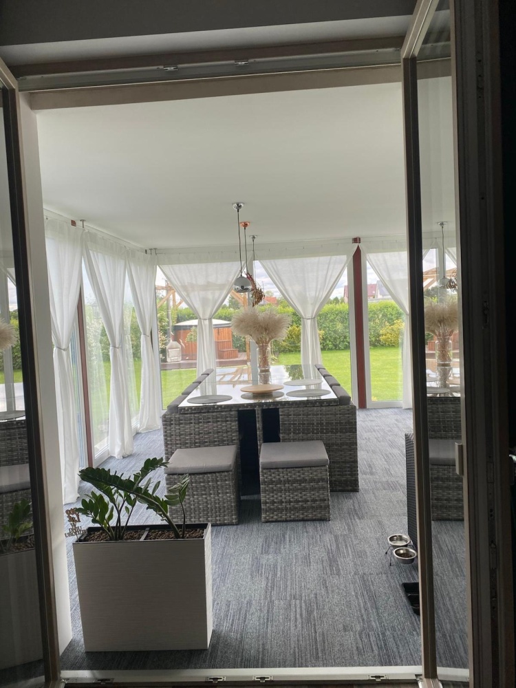• Duży taras przylegający do ogrodu zimowego, jest idealnym miejscem na letnie grillowanie, poranną kawę lub spotkania z przyjaciółmi. Jest on wyposażony w duży drewniany stół z ławkami mieszczący 16 osób.