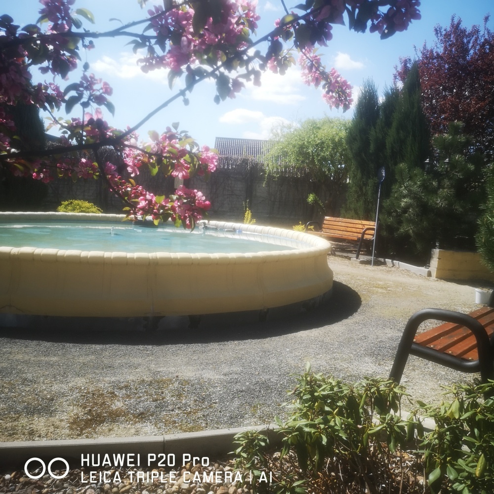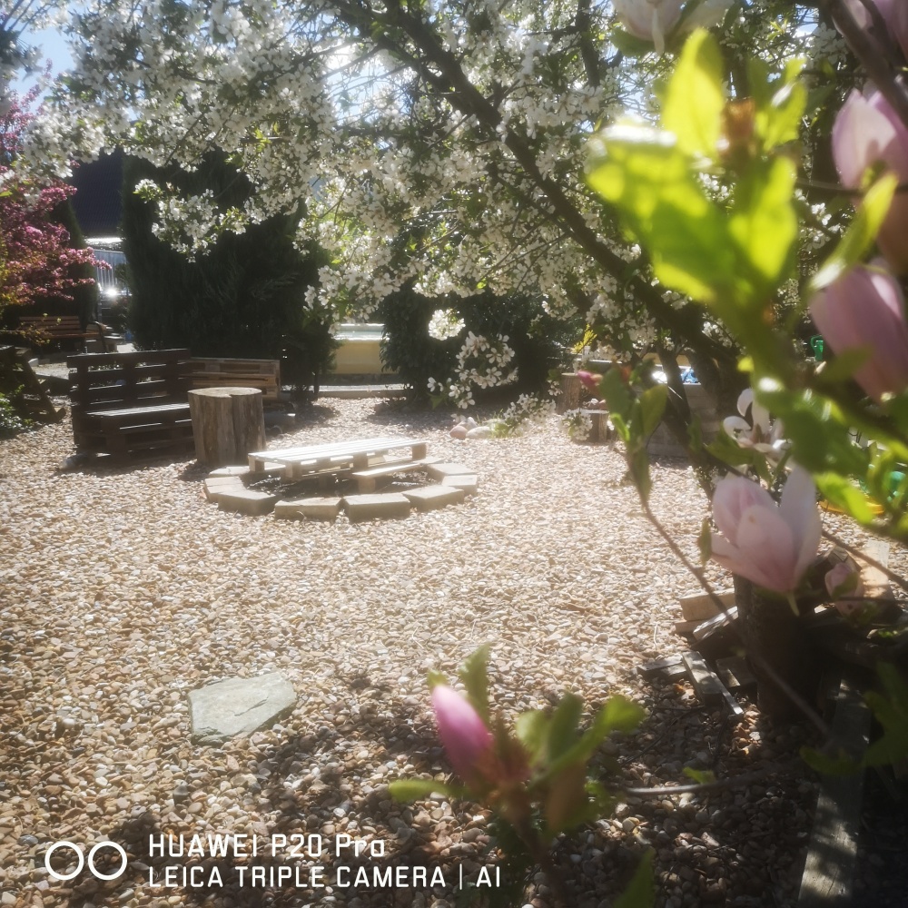 Kameralny zadbany mini park w terenie domu z fontanną, ławkami, miejscem na duże ognisko.