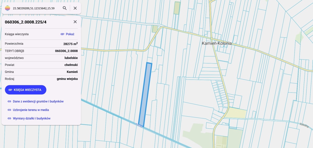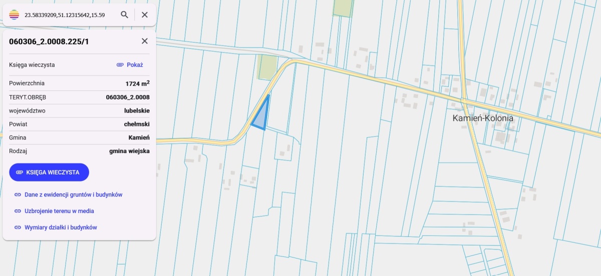 1. Działkę rolno-budowlaną w Kamień-Kolonii o powierzchni 17 arów. Wszystkie media przylegają do działki.