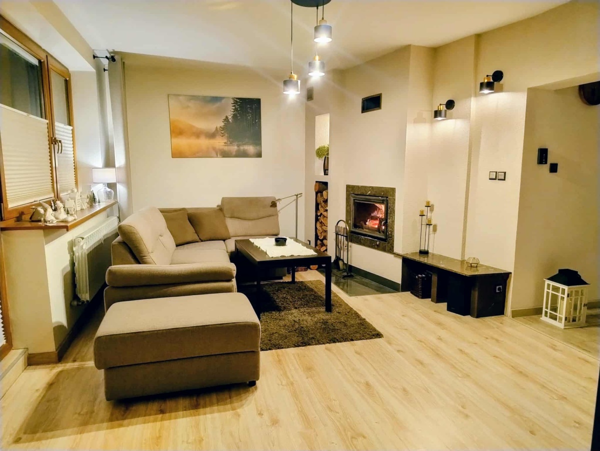 otwarty salon z kominkiem,