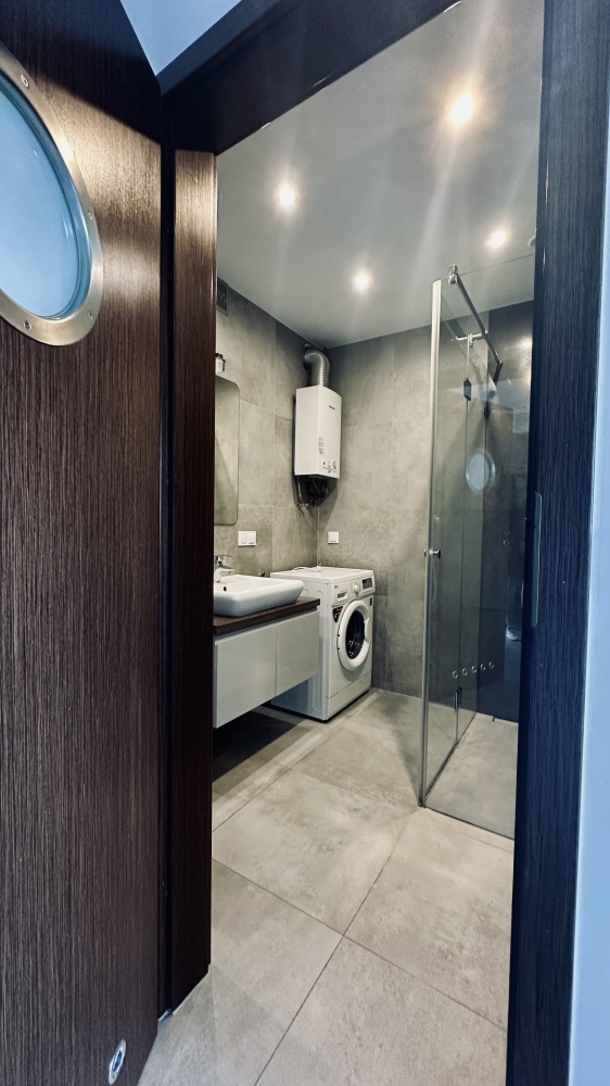 w łazience zainstalowano dużą kabinę prysznicową z odpływem liniowym, toaletę bezkołnierzową.