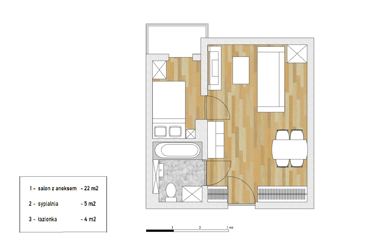 W skład mieszkania wchodzą: salon, kuchnia, łazienka.