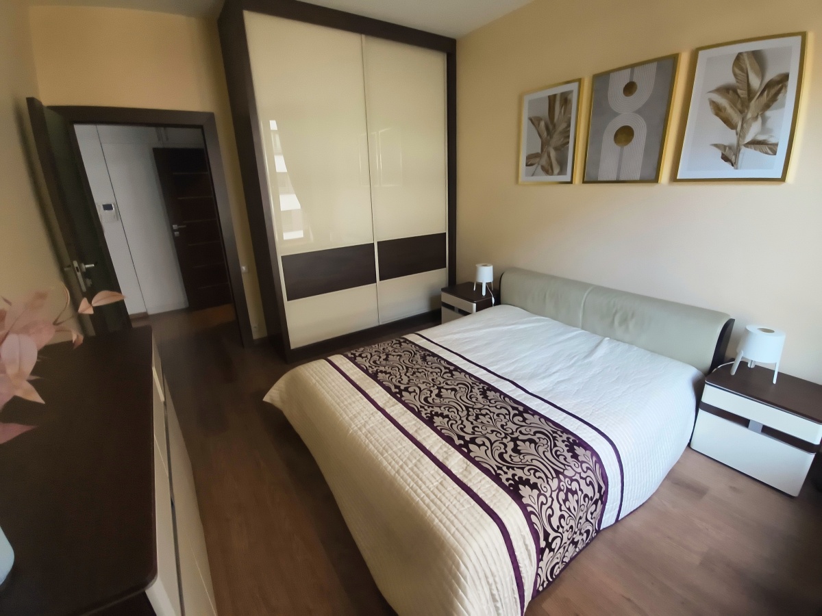 Przytulnej sypialni z dużym łóżkiem idealnym dla pary, pojemną szafą oraz komodą.