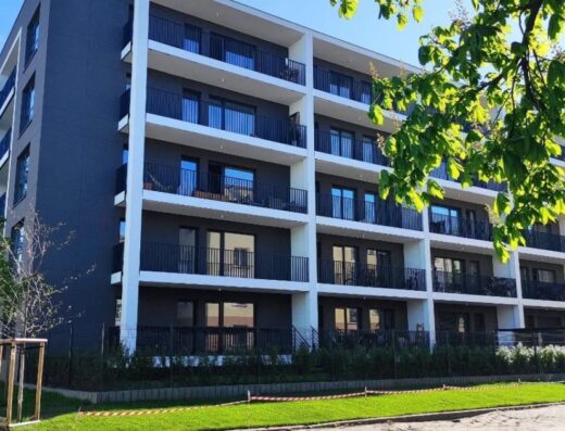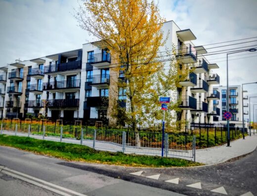 Budynek z wyremontowaną elewacją i zadbaną klatką schodową.