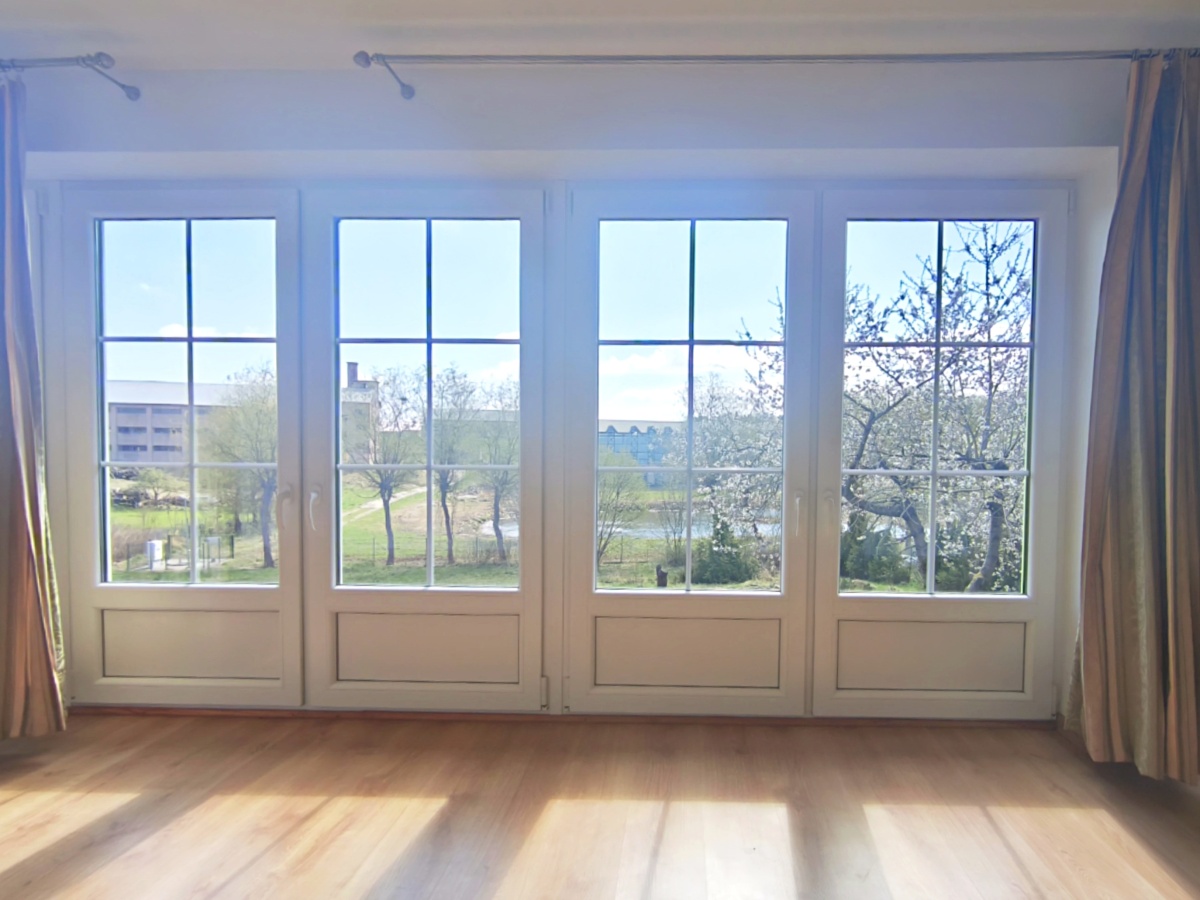duże okna z widokiem na zieleń i wodę , naturalne światło