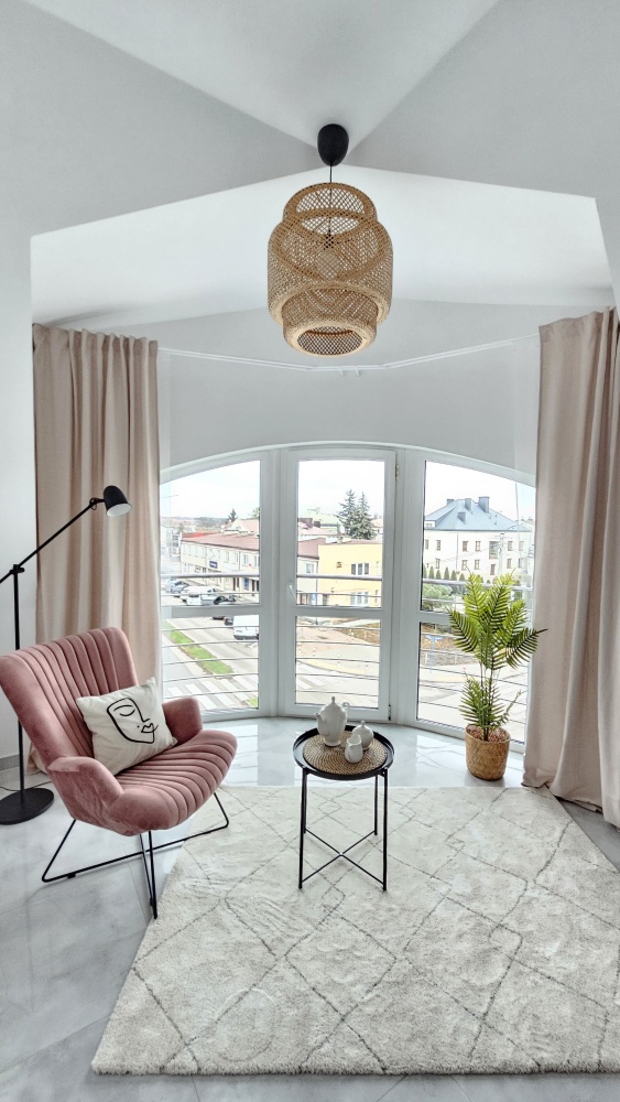 • bardzo słoneczny salon z dużym oknem i otwartym widokiem