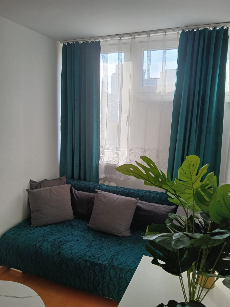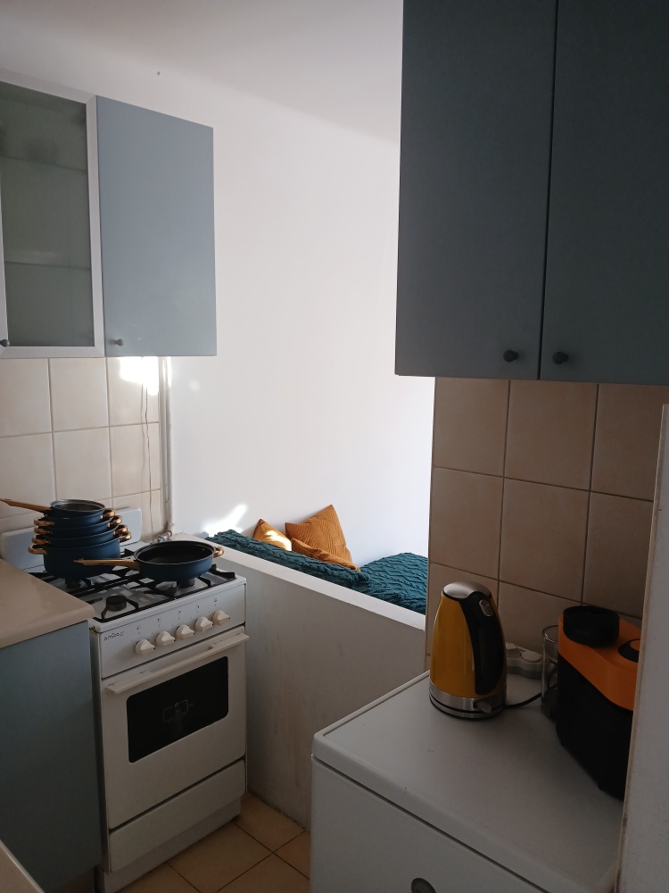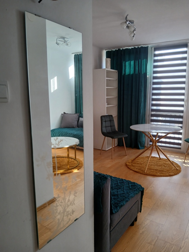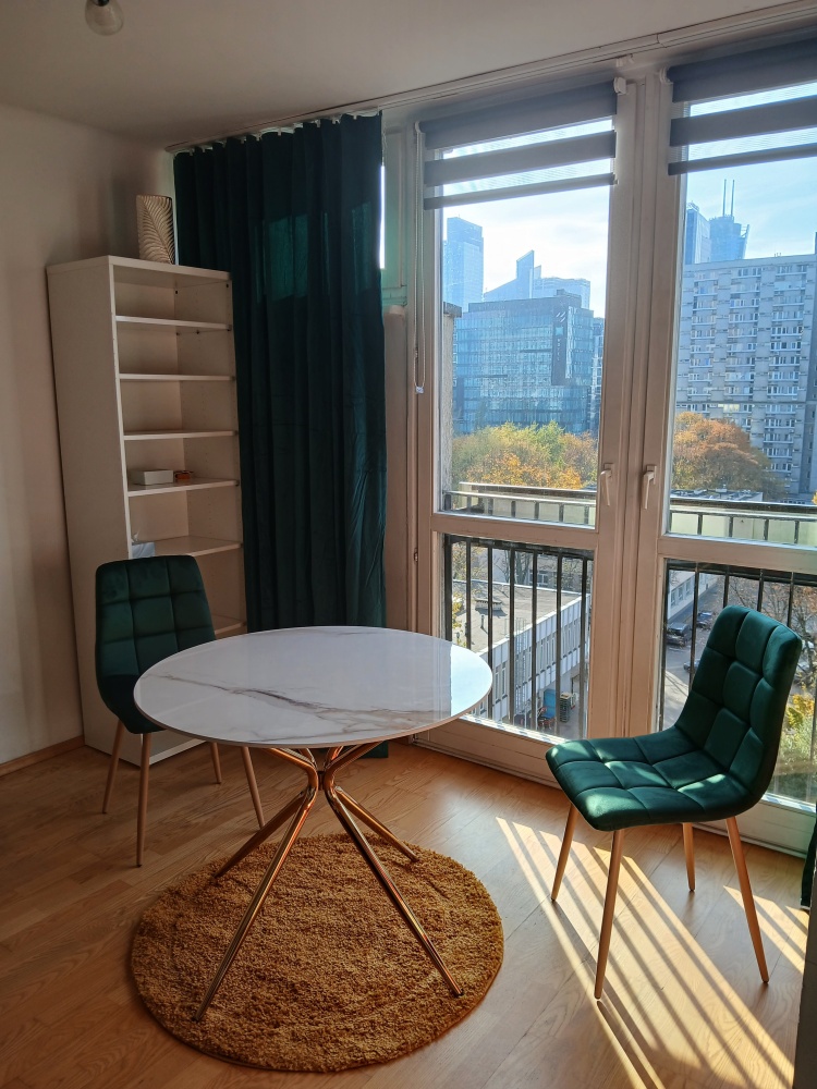 Sypialnia z lozkiem, duza szafa, osobna od pokoju dzienego z kanapa i francuskim oknem z panarama nad Warszawa. Lazienka z nowym prysznicem i nowa pralka. Kuchnia z lodowka i piekarnikem odzielna od pokojow.