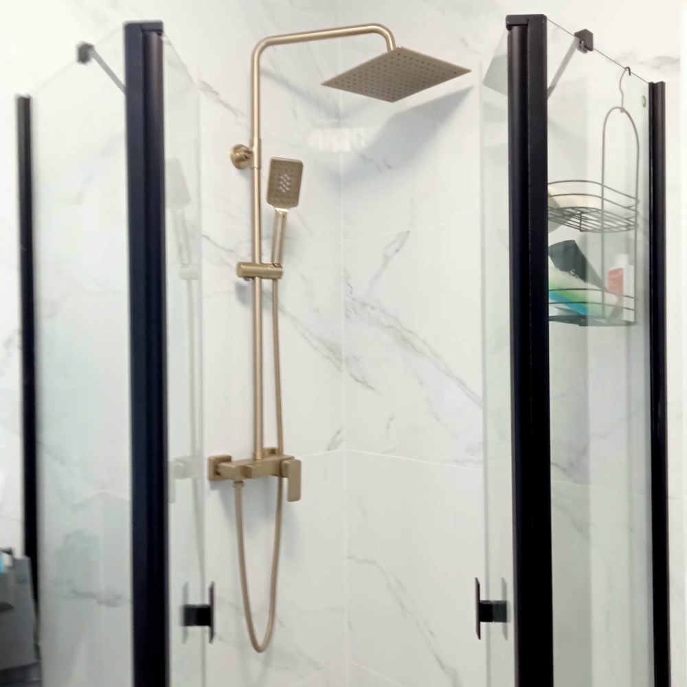 * łazienka z prysznicem walk in, pralka .