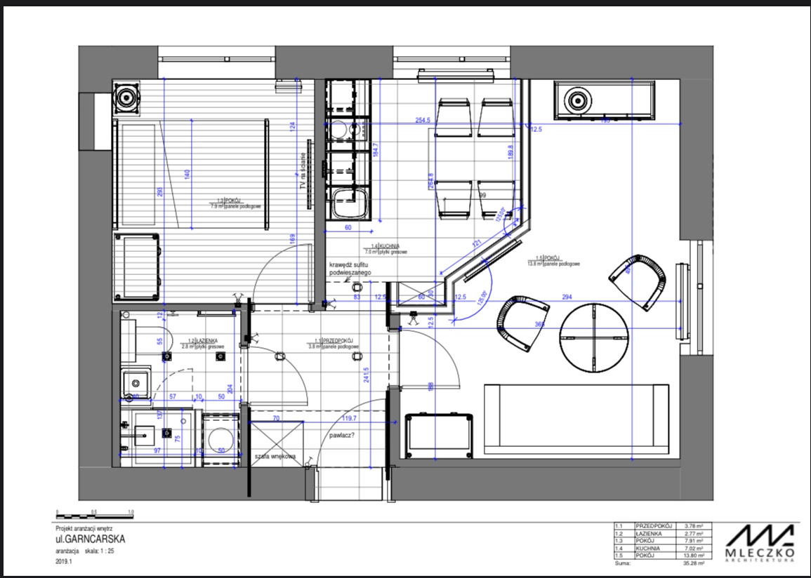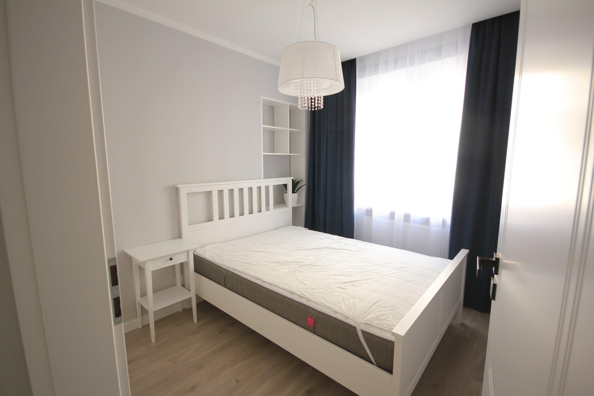 Mieszkanie obecnie jest wynajęte – łóżko zostało przeniesione do salonu a kanapa do pokoju zgodnie z preferencjami najemcy. Układ ten oczywiście można zmienić.