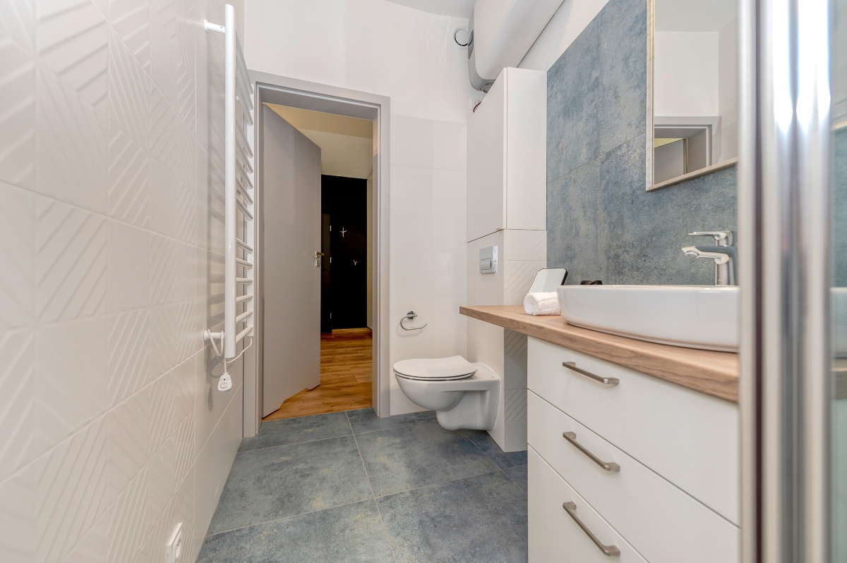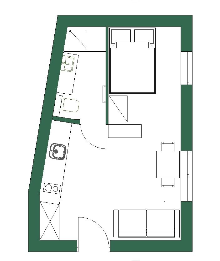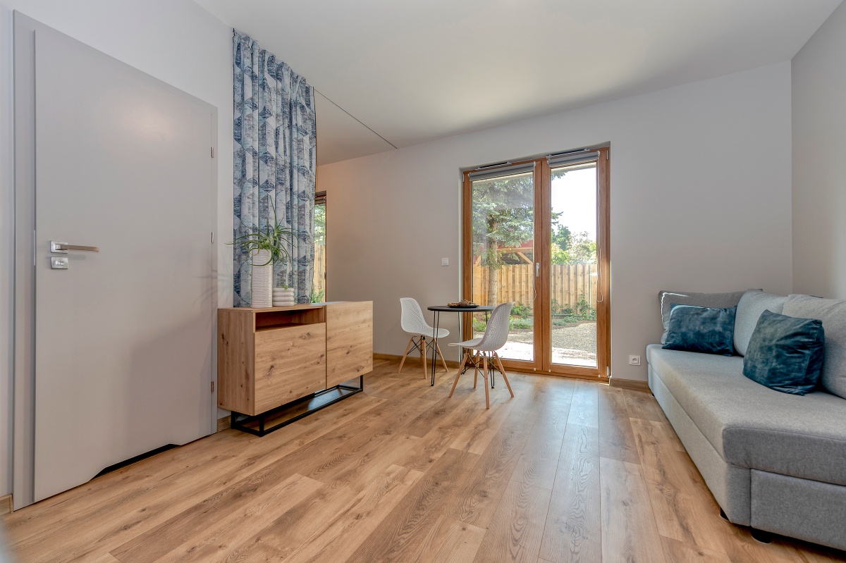 Znajduje się na parterze kameralnego budynku jednorodzinnego. Posiada samodzielne wejście z zewnątrz. Wielkość 25m² mieści salon z otwartą kuchnią, łazienkę oraz aneks sypialniany (łóżko do uzgodnienia). Do dyspozycji najemcy jest otoczony zielenią ogród. Całość wykończona z dbałością o szczegóły.